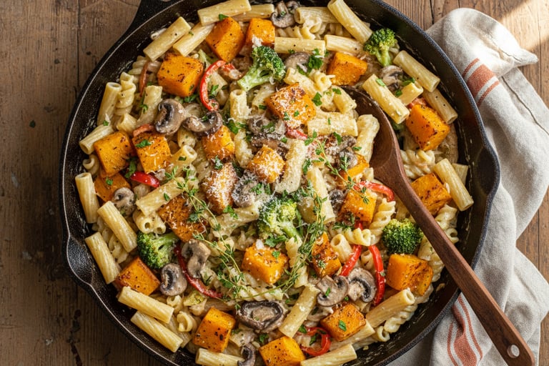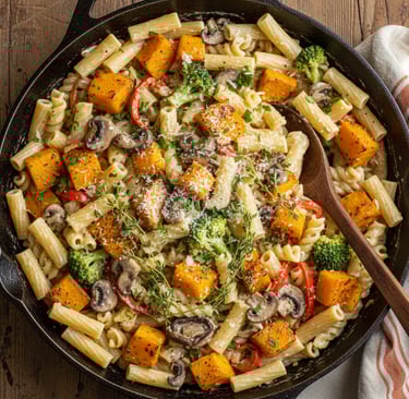 Who says pasta primavera is just for spring? This fall twist uses seasonal vegetables like butternut squash and mushrooms. The genius of one-pot pasta is that you cook the noodles right in the sauce, so they absorb all that flavor while releasing their starch to create a creamy, restaurant-quality sauce.