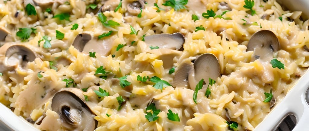 A cozy, creamy bake made with tender rotisserie chicken, hearty rice, and savory mushrooms. This simple casserole comes together fast and delivers big on comfort and flavor.
