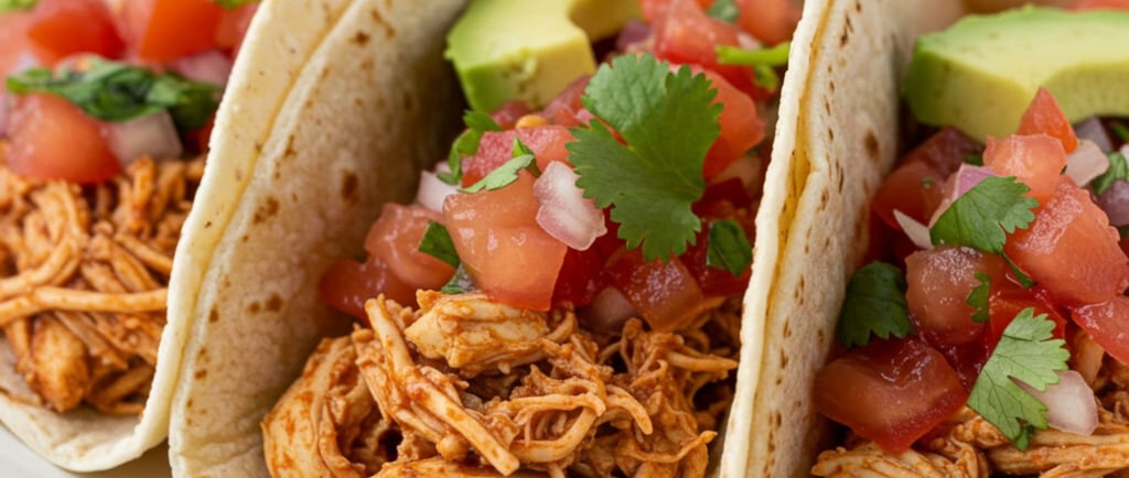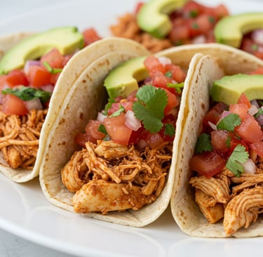 Tender shredded chicken tucked into warm tortillas, topped with fresh salsa and creamy avocado. These tacos come together fast and are packed with flavor, making them a go-to dinner any night of the week.