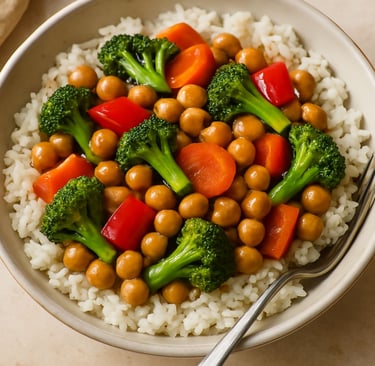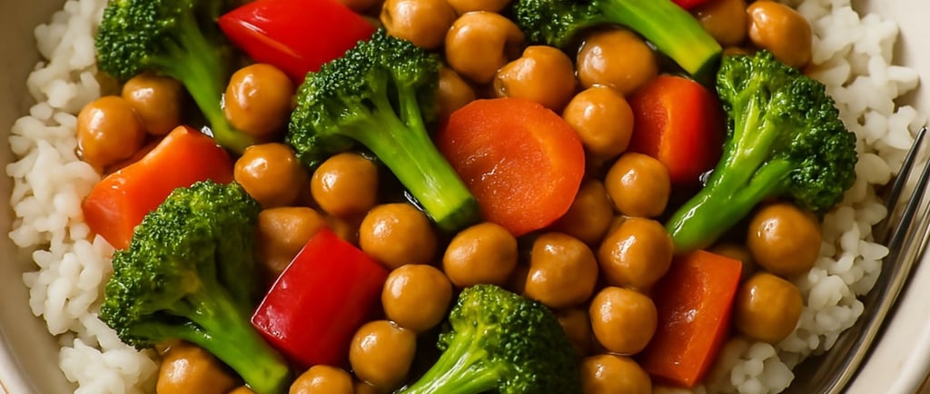 A quick and healthy Chickpea Stir-fry with mixed vegetables, sesame oil, and soy sauce served over rice or quinoa. Ready in just 15 minutes for a delicious and nutritious meal.