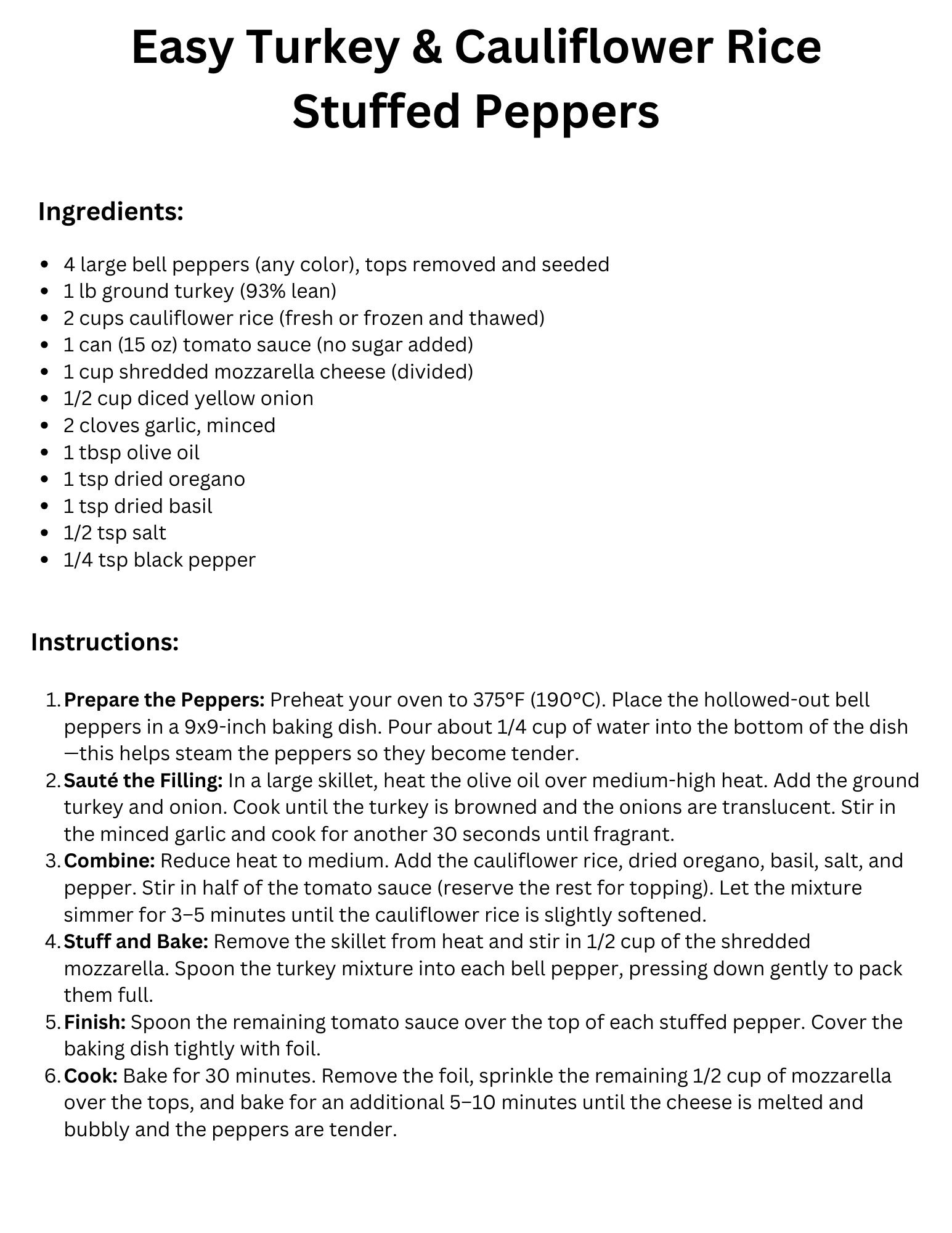 Stuff and Bake: Remove the skillet from heat and stir in 1/2 cup of the shredded mozzarella. Spoon the turkey mixture into each bell pepper, pressing down gently to pack them full.