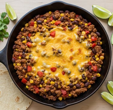 Brown ground beef, add taco seasoning, diced tomatoes, black beans, and corn. Serve with tortillas, rice, or directly from the skillet with toppings like cheese, lettuce, and salsa.